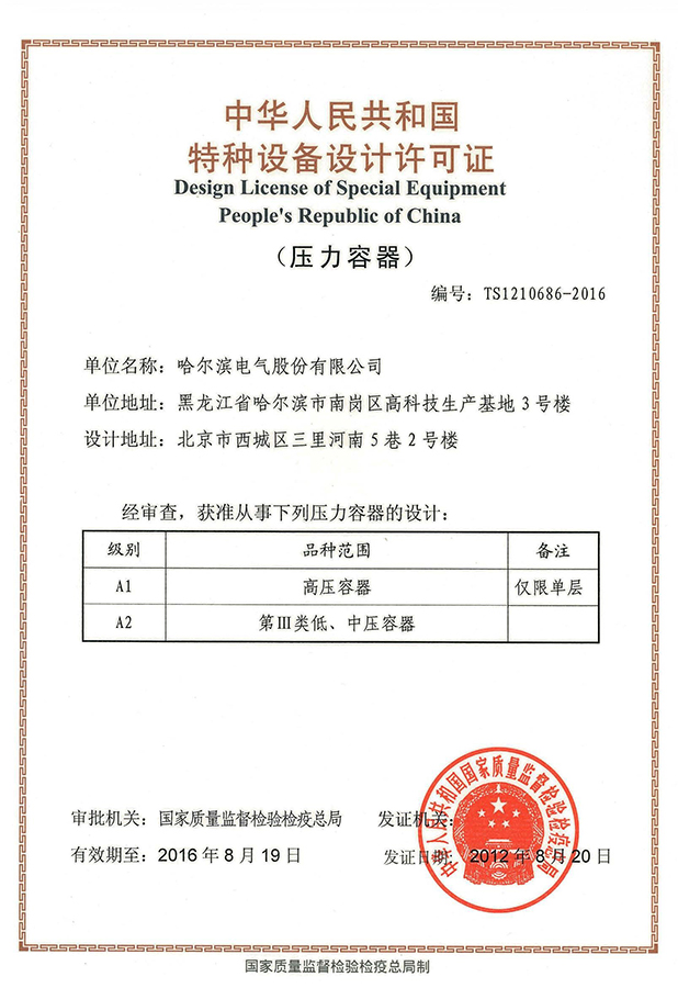 8月20日,,,,,, ,公司取得国家质量监视磨练检疫总局揭晓的“特种装备设计允许证”,,,,,, ,即获准从事A1(高压容器)、A2(第三类低、中压容器)级压力容器设计资格。。。。。。。