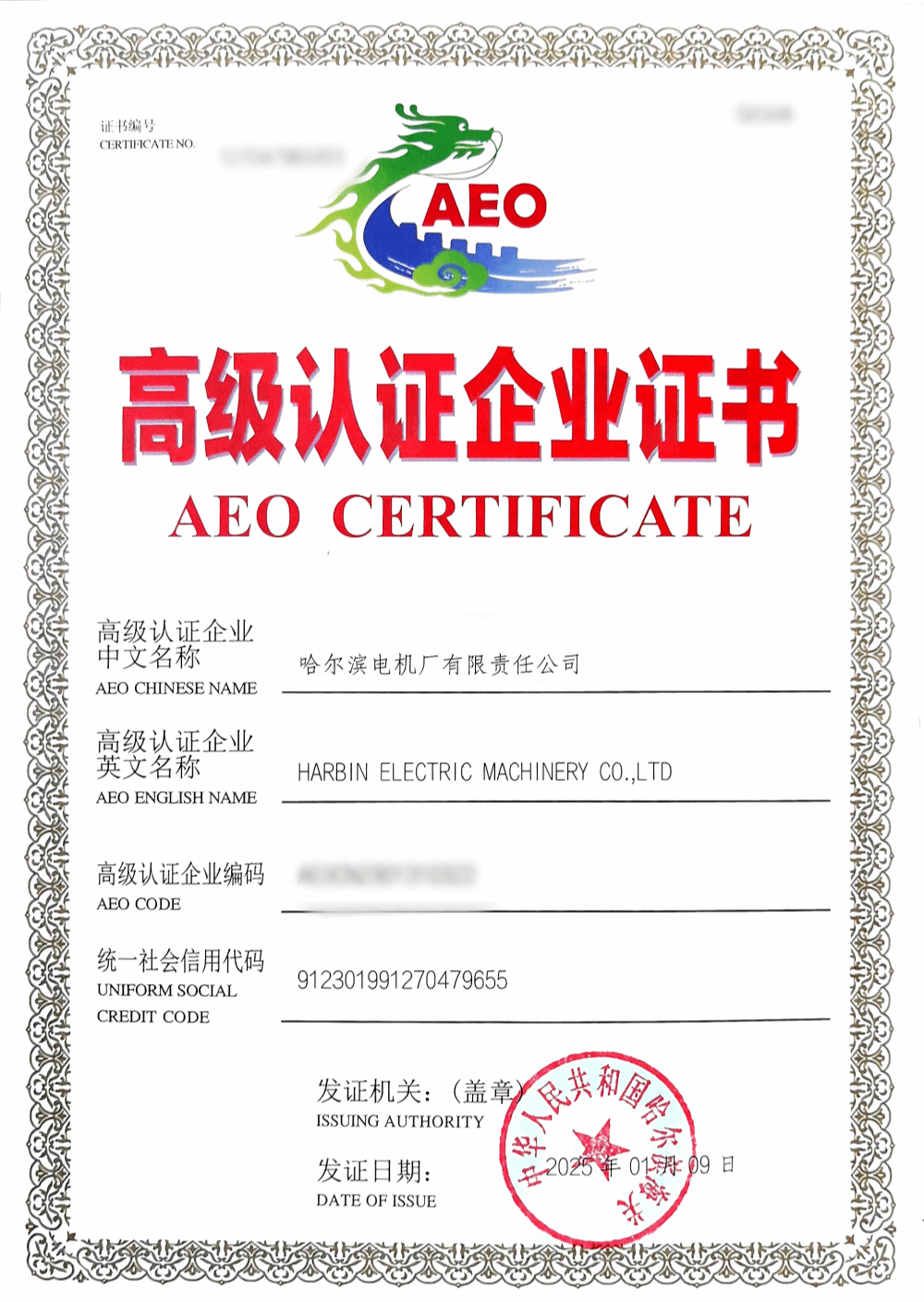 克日,,,,,,哈尔滨电机厂有限责任公司获得海关AEO高级认证。。。。。。1月13日,,,,,,哈尔滨海关举行高级认证企业(AEO)颁证仪式暨政策宣讲会,,,,,,为电机公司等企业揭晓了《AEO高级认证企业证书》。。。。。。
